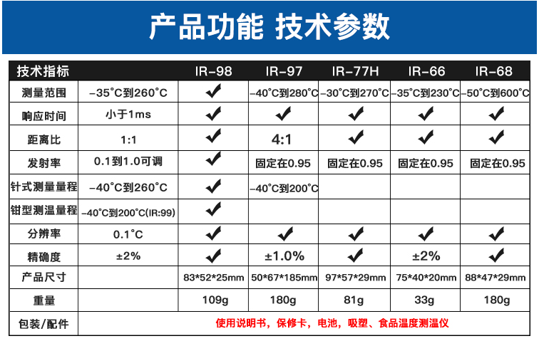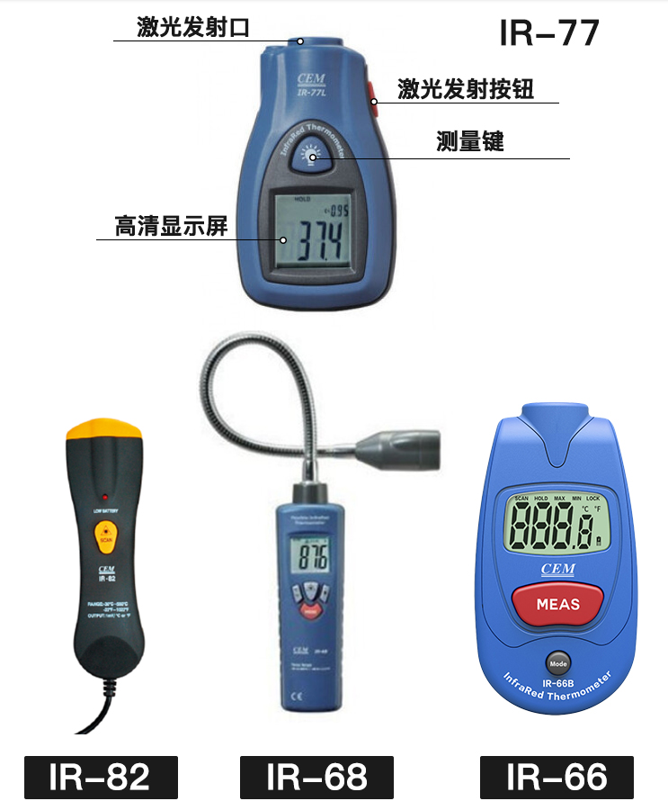 IR-66掌上式紅外測溫儀包括IR-66、IR-66B兩個型號。 CEM出品的IR-66系列掌上式紅外線測溫儀,符合人體工程學(xué)設(shè)計,其體積比手掌還小,方便攜帶,是您工作上各種設(shè)備檢修、溫度情況了解,以及您日常生活起居的多功能測溫儀佳選擇。 IR-66掌上式紅外線測溫儀特性: 1.*的非接觸式測量 2.獨特新穎的外觀設(shè)計 3.自動關(guān)機及自動記錄數(shù)據(jù) 4.℃/℉ 轉(zhuǎn)換裝置 5.自動量程選擇及大小值記錄 6.小巧的尺寸設(shè)計使測量方便又便于攜帶 7.大的液晶顯示屏 8.上鎖功能及低電量提示
