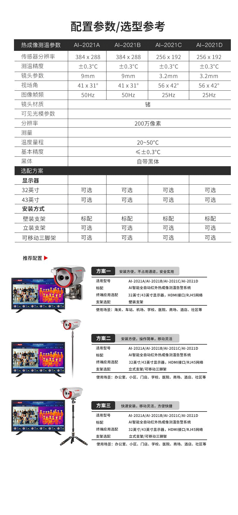 2安裝與維護(hù) 2-1,紅外熱像告警系統(tǒng)部署原則 AI-2021紅外熱像告警系統(tǒng)屬于精密測(cè)溫和成像設(shè)備,對(duì)部署應(yīng)用有一定要求,注意事項(xiàng)如下: ·安裝環(huán)境:設(shè)備機(jī)頭所處位置需光線良好(照明度≥10OLux),應(yīng)避免處于逆光的位置;設(shè)備機(jī)頭布置位置附近3米范圍內(nèi)不應(yīng)有空調(diào)出風(fēng)口;設(shè)備機(jī)頭所監(jiān)控的視場(chǎng)內(nèi),不能受到光照、西曬等外界強(qiáng)熱源的干擾; ·機(jī)頭布置:合理布置AI-2021機(jī)頭的位置,向下俯視角度為13°~15°;合理布局人員檢測(cè)位置和范圍,Al-2021機(jī)頭的攝像頭距離被測(cè)人員的額頭的位置為1.0~5.0米,最佳測(cè)試位置為2.0米; ·被測(cè)人員要求:戶(hù)外陽(yáng)光照射后,或者劇烈運(yùn)動(dòng)后,需在室內(nèi)環(huán)境平靜適應(yīng)5分鐘后進(jìn)行測(cè)試;人員從戶(hù)外場(chǎng)景進(jìn)入室內(nèi),建議經(jīng)過(guò)回廊緩沖至少10秒鐘后,再步入檢測(cè)位置,如果室內(nèi)外溫差較大時(shí),建議在室內(nèi)停留2~3min再行檢測(cè);確保待測(cè)人員整個(gè)面部處于設(shè)備攝像視野內(nèi),同時(shí)面部及額頭不能被遮擋(帽子、圍巾、墨鏡、面具、退燒貼等可能遮擋面部的物件,建議先提前摘下,適應(yīng)0.5-1分鐘后再進(jìn)行測(cè)試。)