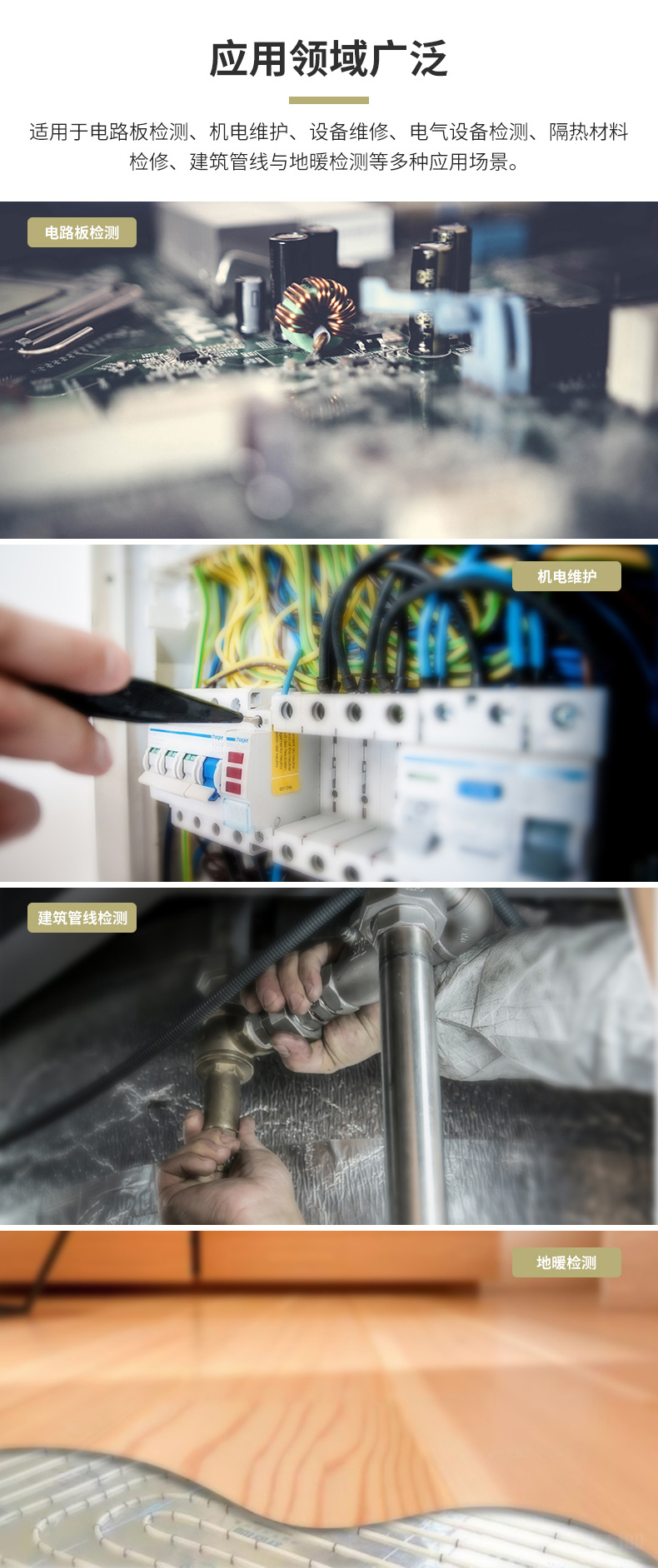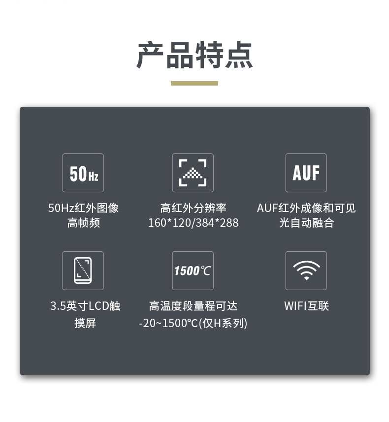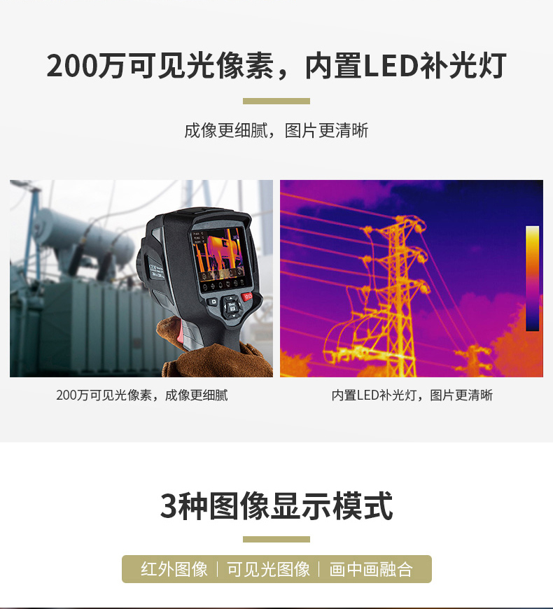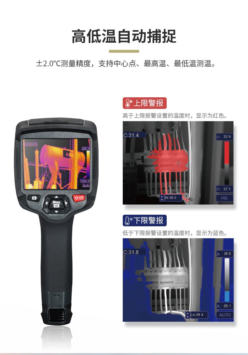標(biāo)配鏡頭22mm,分辨率324×288,IFOV:1.14mard,視場角24.5×18.6°,熱靈敏度NETD<0.06℃,圖像幀頻50Hz,溫度范圍(-20-150、0-400),可見光分辨率640×480像素