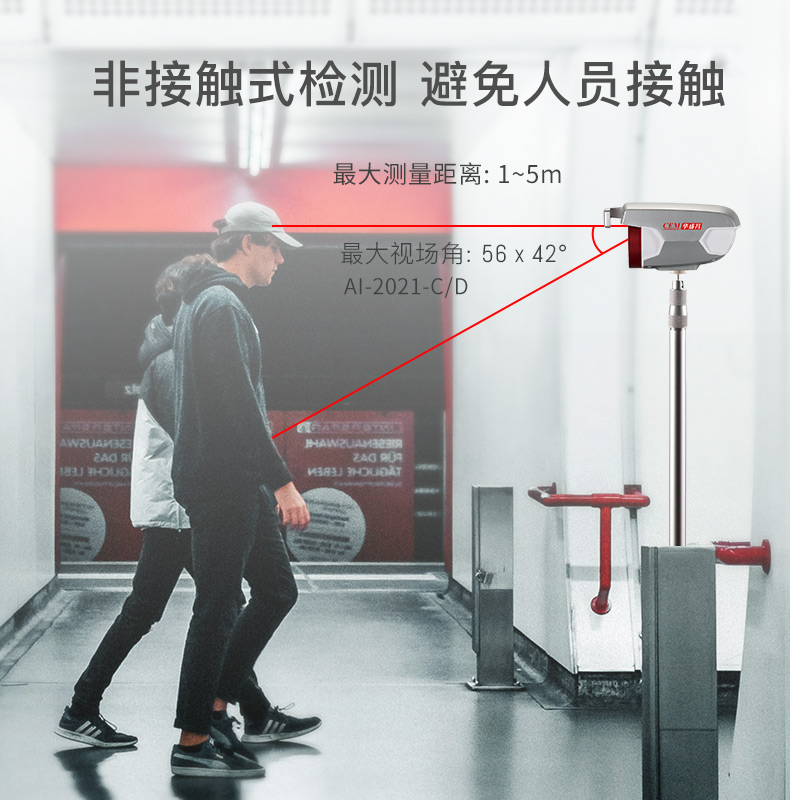 2安裝與維護(hù) 2-1,紅外熱像告警系統(tǒng)部署原則 Al-2021紅外熱像告警系統(tǒng)屬于精密測(cè)溫和成像設(shè)備,對(duì)部署應(yīng)用有一定要求,注意事項(xiàng)如下: ·安裝環(huán)境:設(shè)備機(jī)頭所處位置需光線良好(照明度≥10OLux),應(yīng)避免處于逆光的位置;設(shè)備機(jī)頭布置位置附近3米范圍內(nèi)不應(yīng)有空調(diào)出風(fēng)口;設(shè)備機(jī)頭所監(jiān)控的視場(chǎng)內(nèi),不能受到光照、西曬等外界強(qiáng)熱源的干擾; ·機(jī)頭布置:合理布置A-2021機(jī)頭的位置,向下俯視角度為13°~15°;合理布局人員檢測(cè)位置和范圍,AI-2021機(jī)頭的攝像頭距離被測(cè)人員的額頭的位置為1.0~5.0米,最佳測(cè)試位置為2.0米;