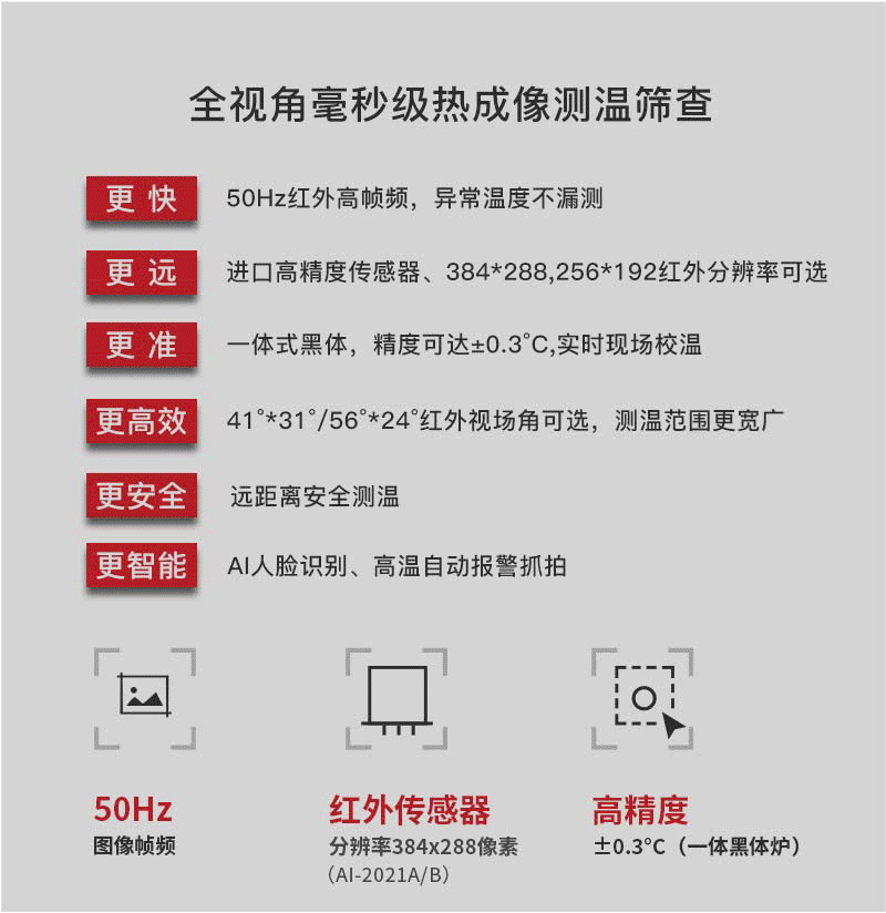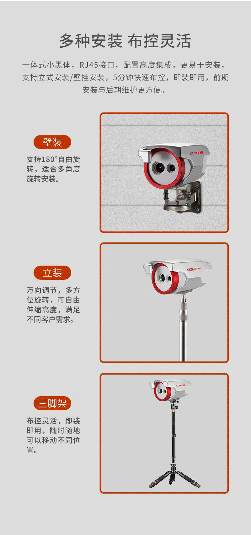 注意事項(xiàng) 紅外熱像告警系統(tǒng)應(yīng)正確安裝,可自動(dòng)跟蹤人體額頭區(qū)域并顯示體溫,操作人員應(yīng)經(jīng)生產(chǎn)廠家專業(yè)培訓(xùn),并嚴(yán)格按說(shuō)明書使用。 ·應(yīng)嚴(yán)格按照中國(guó)國(guó)標(biāo)(GB_T19146-2010)和各地市場(chǎng)監(jiān)管局的要求創(chuàng)造使用條件;﹒嚴(yán)格按照規(guī)范要求,安裝在室內(nèi)無(wú)風(fēng)或者微風(fēng)的固定位置使用,室溫環(huán)境在16°℃~32℃,避免陽(yáng)光、風(fēng)和其他熱源干擾(環(huán)境溫度超出16°℃~32°℃,需要安裝空調(diào),并在產(chǎn)品3m內(nèi)無(wú)風(fēng)或者微風(fēng)); ·若安裝在室外,必須搭建棚子或者板房來(lái)保證環(huán)境穩(wěn)定; ·戶外陽(yáng)光照射后、劇烈運(yùn)動(dòng)后或從溫差較大的戶外場(chǎng)景進(jìn)入室內(nèi),需在室內(nèi)環(huán)境平靜靜置5分鐘后進(jìn)行測(cè)試。