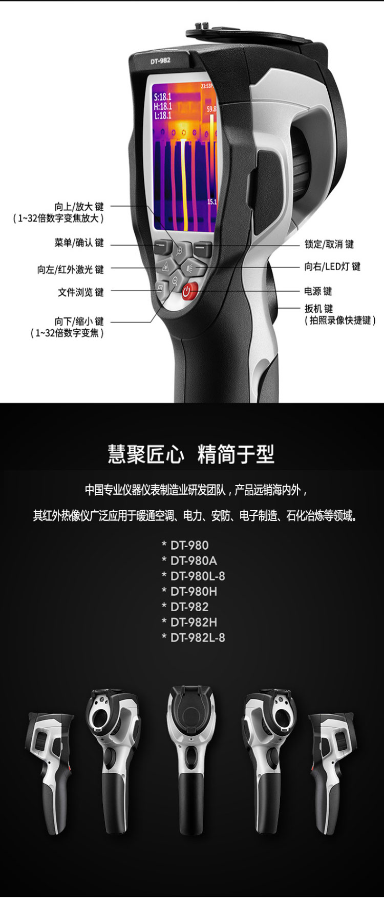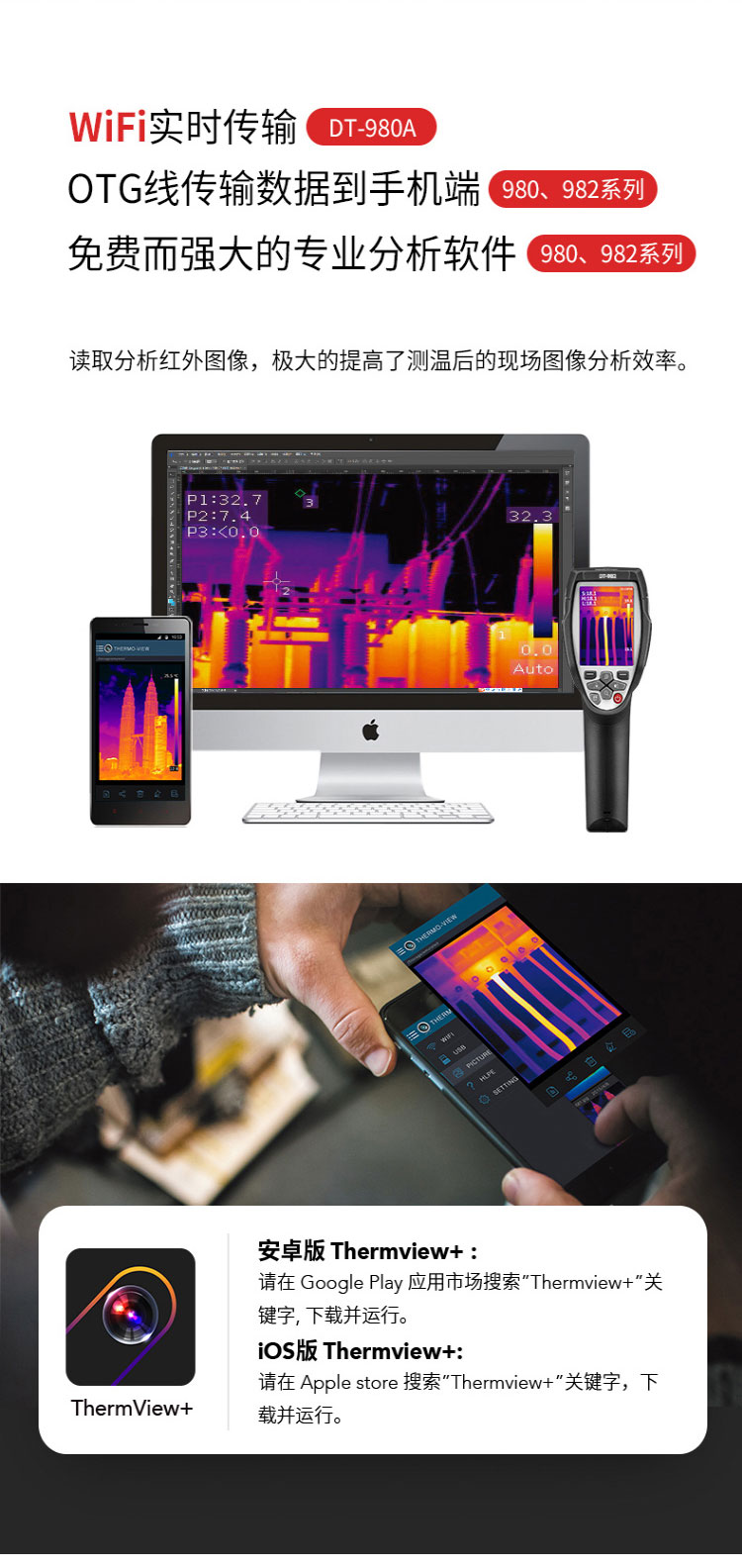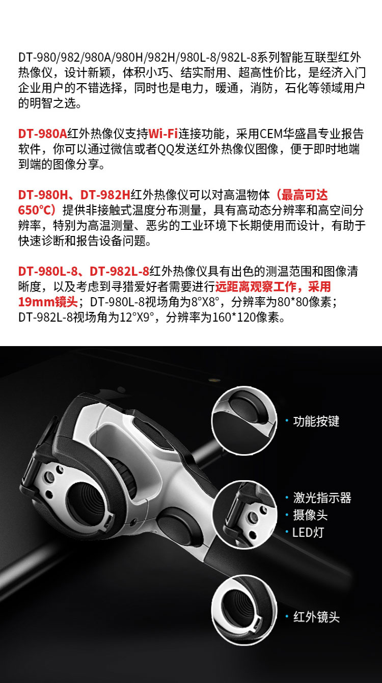 標(biāo)配鏡頭7.5mm,分辨率80×80,IFOV:3.77mard,視場角17×17°,熱靈敏度NETD<0.06℃,圖像幀頻50Hz,溫度范圍(-20-150、0-650),可見光分辨率500萬像素