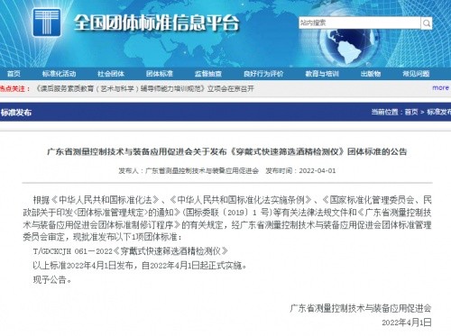 近日,由我們總公司深圳市華盛昌科技實業(yè)股份有限公司牽頭起草的《穿戴式快速篩選酒精檢測儀》團體標準審定會已經(jīng)過廣東省測量控制技術(shù)與裝備應(yīng)用促進會的審查,《穿戴式快速篩選酒精檢測儀》團體標準于2022年4月1日在全國團體標準信息平臺正式發(fā)布并實施。